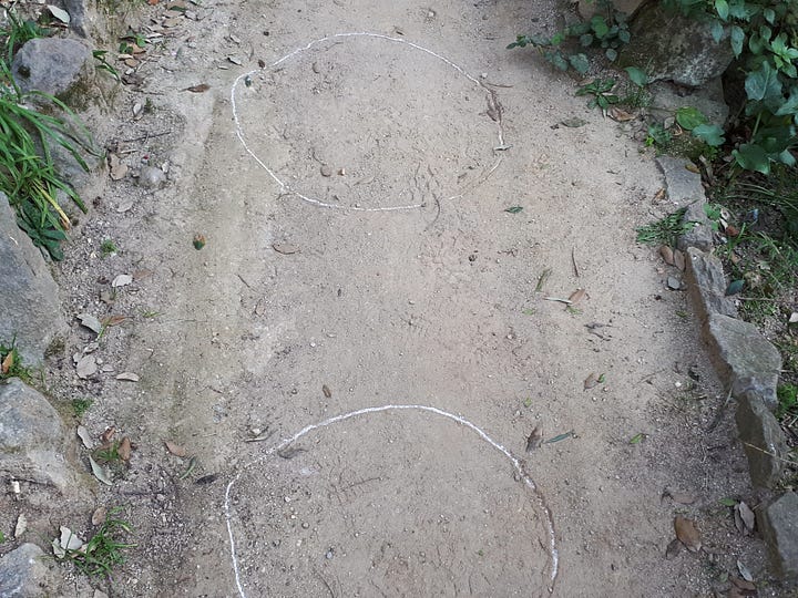 In a garden in the city of Barcelona, far from the main boulevards and traffic, the blackbirds were singing strongly. I had brought a circle in my bag, and it seemed appropriate to move the moons in three stages: